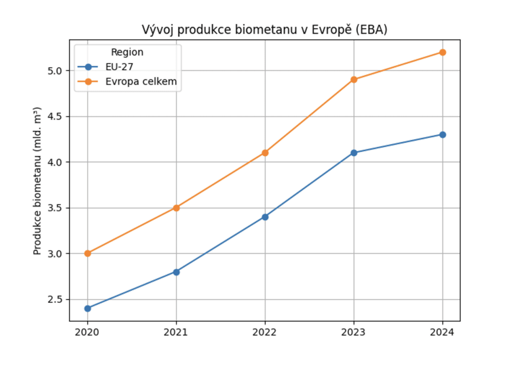 Podle statistické zprávy Evropské bioplynové asociace (EBA) vzrostla produkce biometanu v Evropě v roce 2024 na 5,2 miliardy m3 (54 TWh). Sektor tak potvrzuje dlouhodobý dynamický růst a postupně posiluje svou roli v evropském energetickém mixu. Mezi nejrychleji rostoucí trhy patří zejména Francie a Dánsko, kde biometan již dnes pokrývá významnou část domácí spotřeby zemního plynu. V Česku byl rozvoj výroby biometanu brzděn zejména nejasnými podmínkami podpory a pomalejšími povolovacími procesy. Přesto jeho produkce meziročně vzrostla ze 103 GWh na 211 GWh. Tuzemský trh tak postupně dohání evropský trend, v absolutním objemu výroby však zatím za většinou vyspělých evropských zemí zaostává.